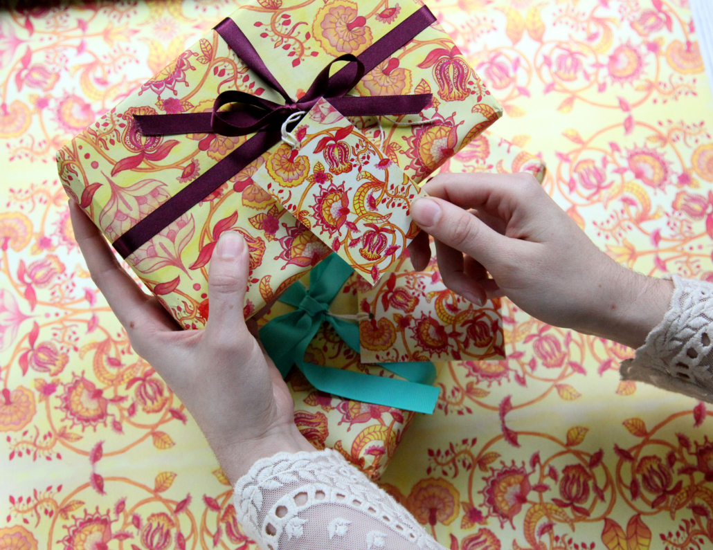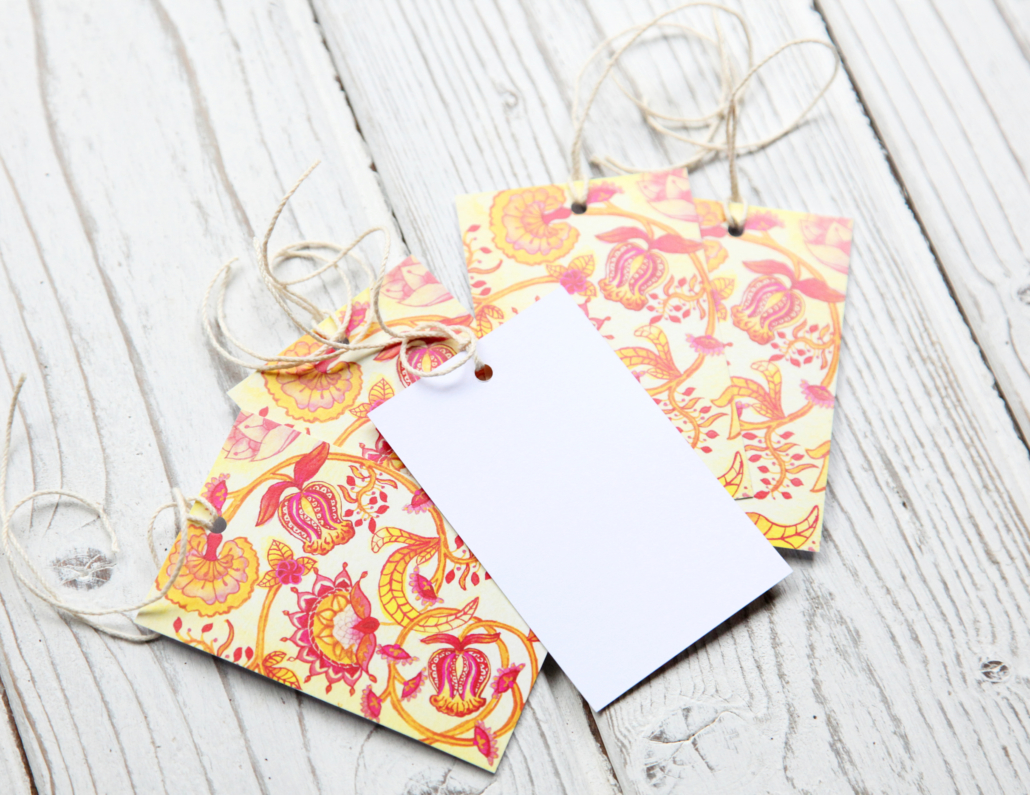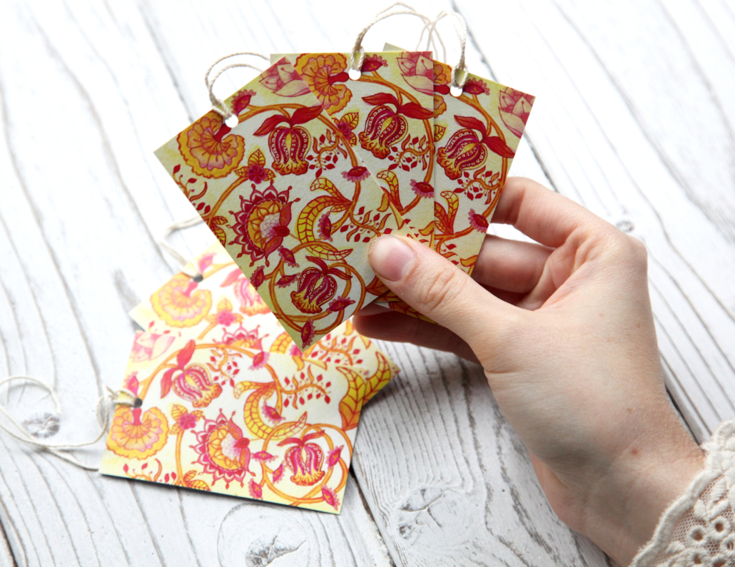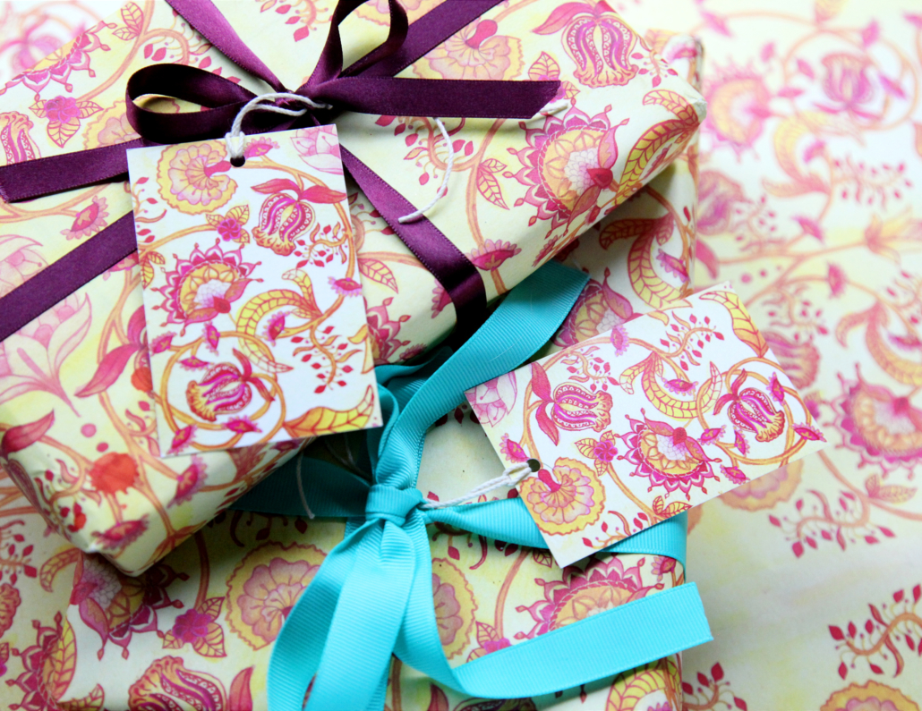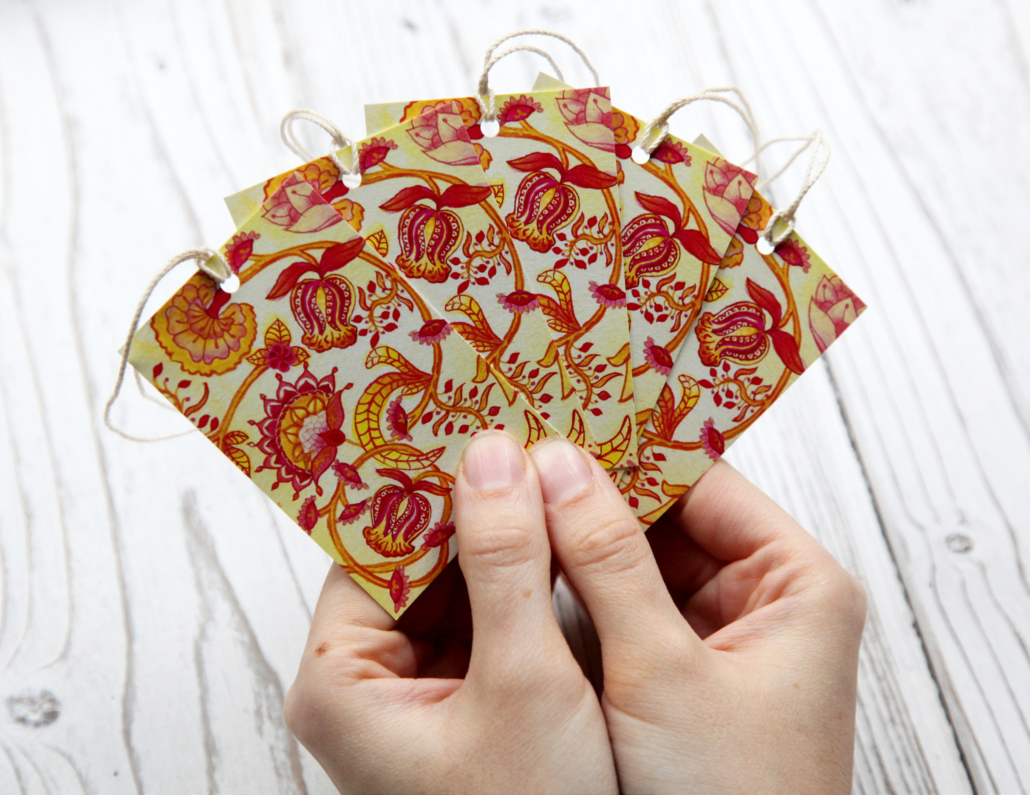 These bright, floral print gift tags were inspired by a trip to the V&A Museum in London and 18th Century block-printing. They came as a set of five and have matching wrapping paper available.