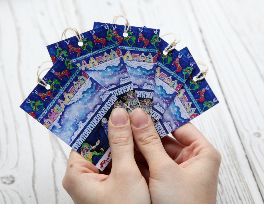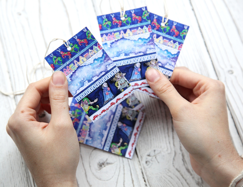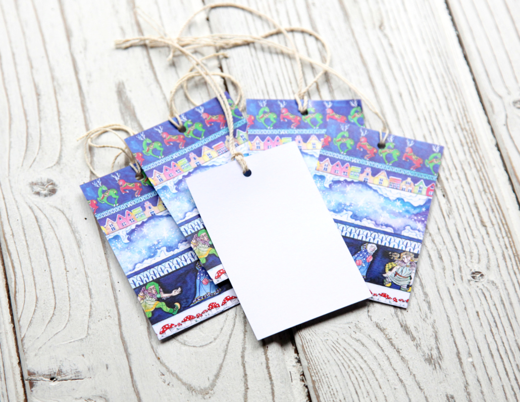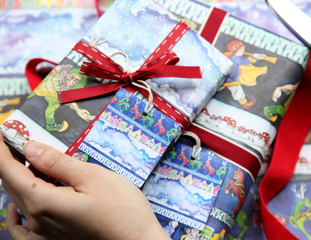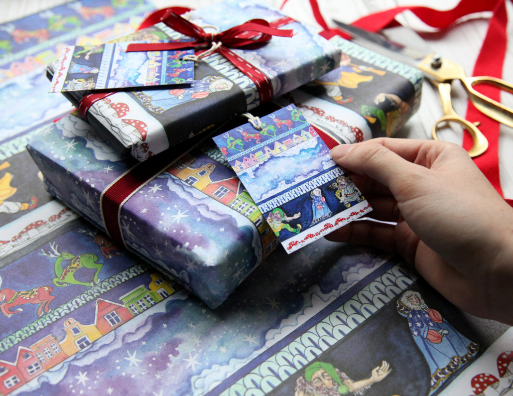This gift tag design has been hand painted with Gouache and Watercolour paints before being printed on 100% recycled card. It also features a starry night sky, festive houses, colourful reindeer and a mushroom or two! Truly unique Christmas wrapping full of winter magic.